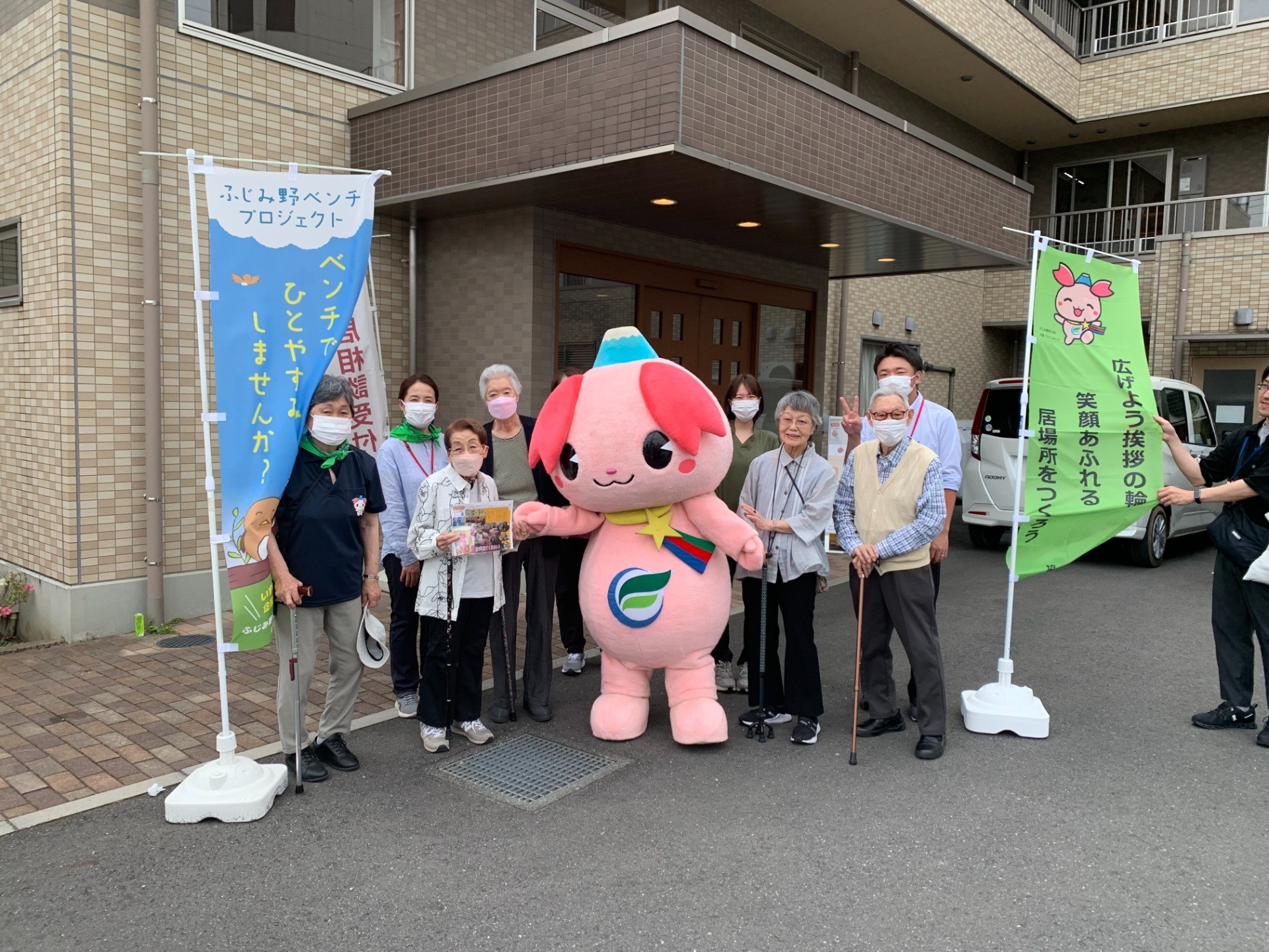 かすみがおか圏域では、地域の情報交換会(協議体)で話し合った地域像「広げようあいさつの輪 笑顔あふれる居場所をつくろう」を合言葉に、あいさつから始まる地域のつながりづくりを目指し、令和5年度から毎年2回ずつ、あいさつキャラバンを行っています。 その他、にじいろTIME(霞ケ丘地区の自治会、民生委員、社協支部の三者による情報交換会)、ベンチプロジェクト、みんなで遊ぼうプロジェクトを行っています。