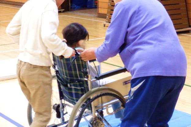 車椅子のたたみ方、広げ方、乗り降りの際の注意点、段差や坂道の介助 技術などを学ぶと共に、介助される側の立場や気持ちについても学習しま す。
