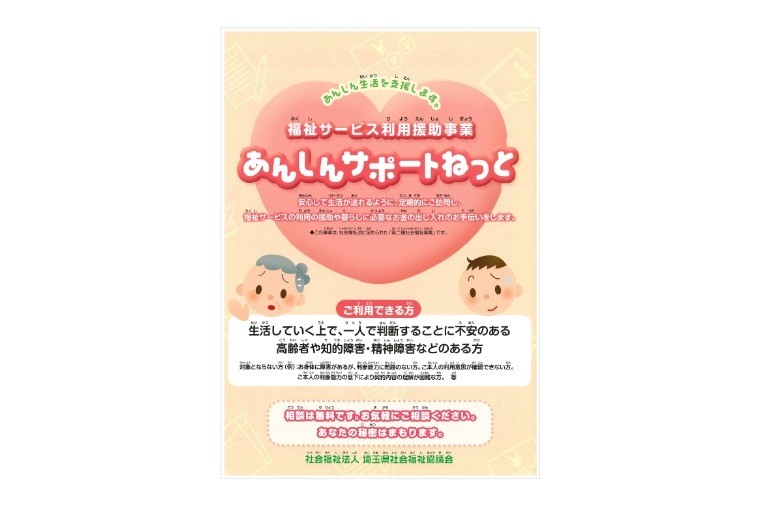 社会福祉法人埼玉県社会福祉協議会の委託事業として実施する、福祉サービス利用援助事業「あんしんサポートねっと」についてのページです。 福祉サービス利用援助事業は一人で判断することに不安のある高齢者や知的障がい・精神障がいなどのある方が安心して生活が送れるよう支援する事業で、社会福祉法に定められた「第二種社会福祉事業」です。